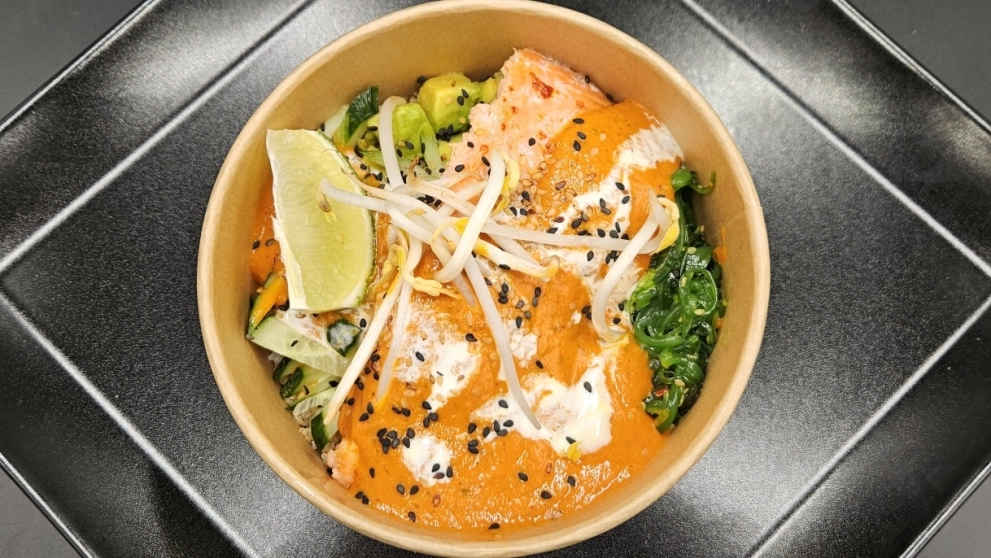 quinoás barna rizs, lazac steak, avokádó, uborka, wakame algasaláta, kókuszos currykrém, szezámmag