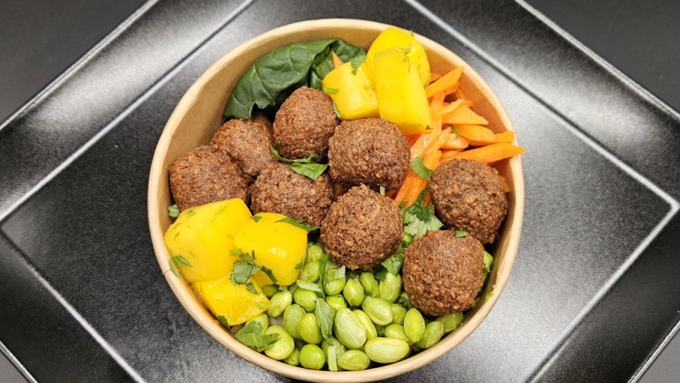 bulgur, falafel, bébispenót, avokádó, julien répa, szójabab, lime-os mangó, koriander