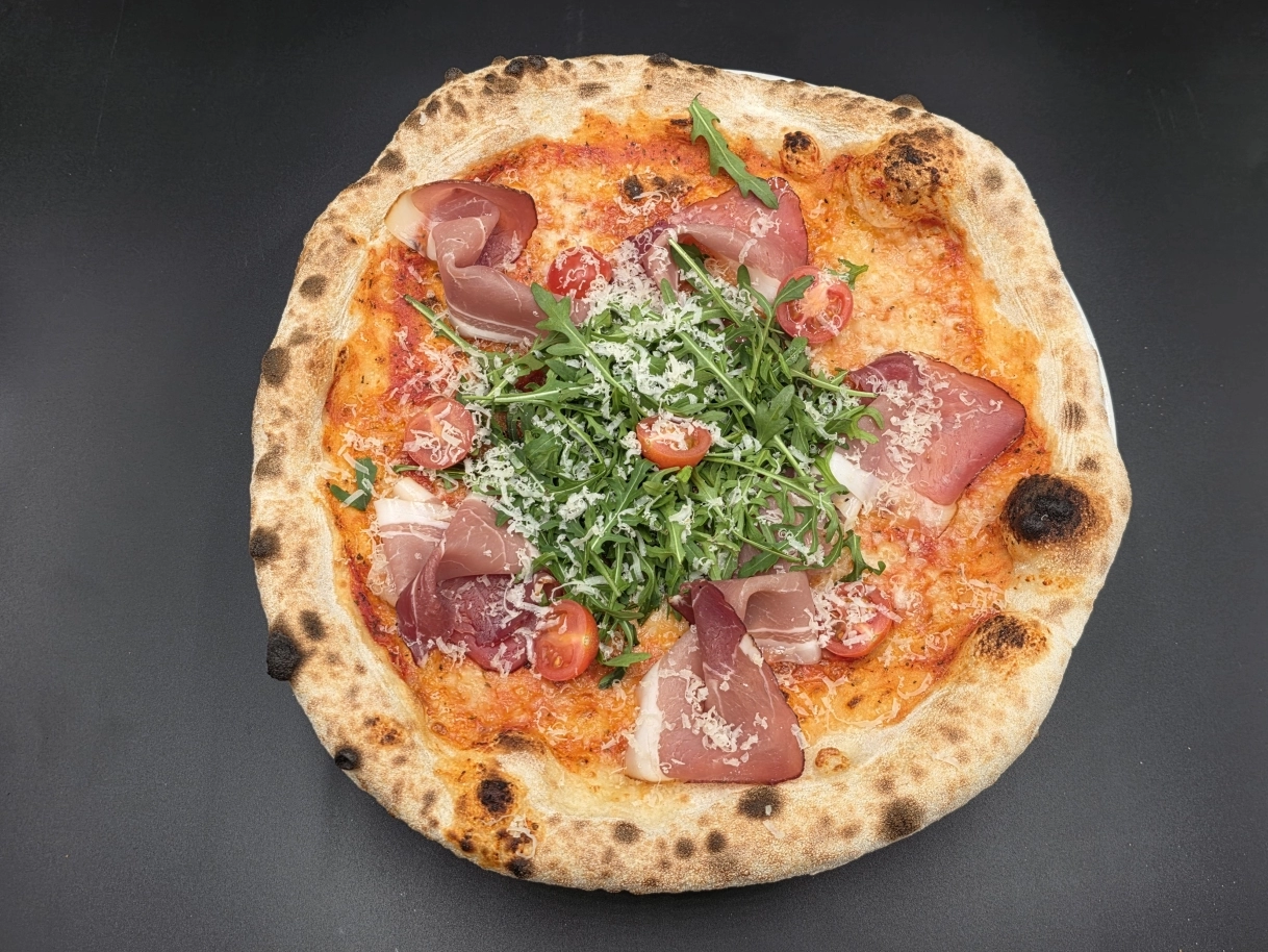 San Marzano paradicsomos alap, mozzarella, pármai sonka, rukkola, parmezán, koktélparadicsom